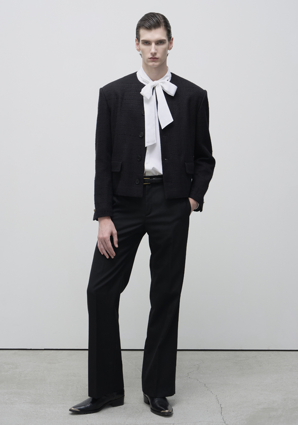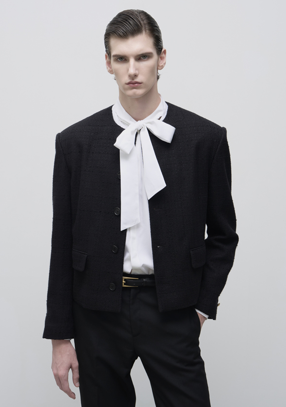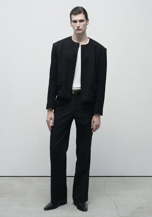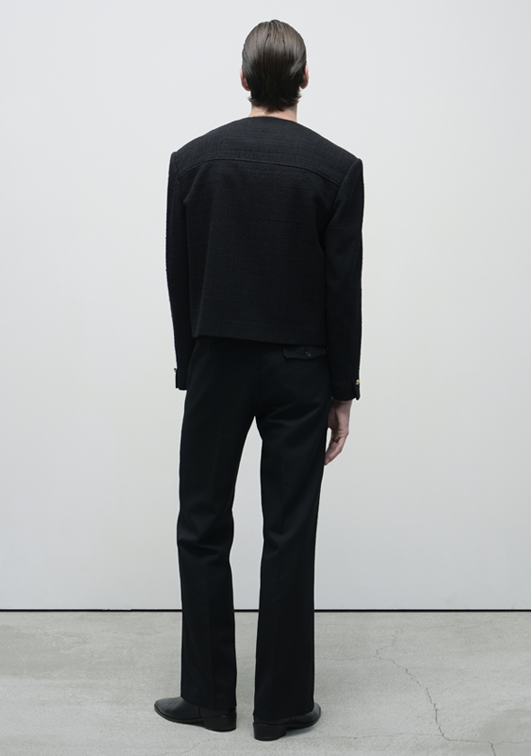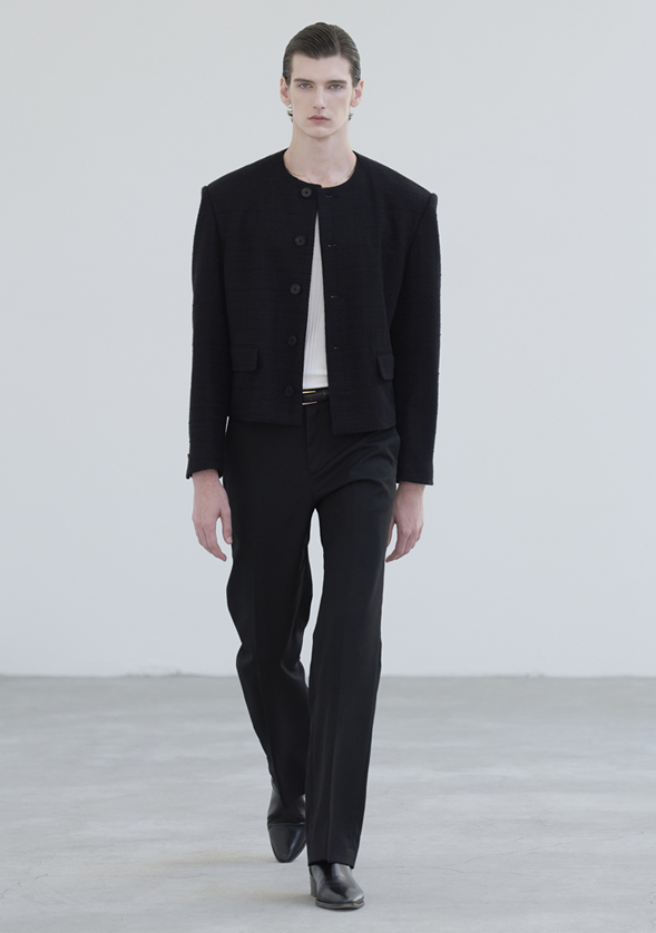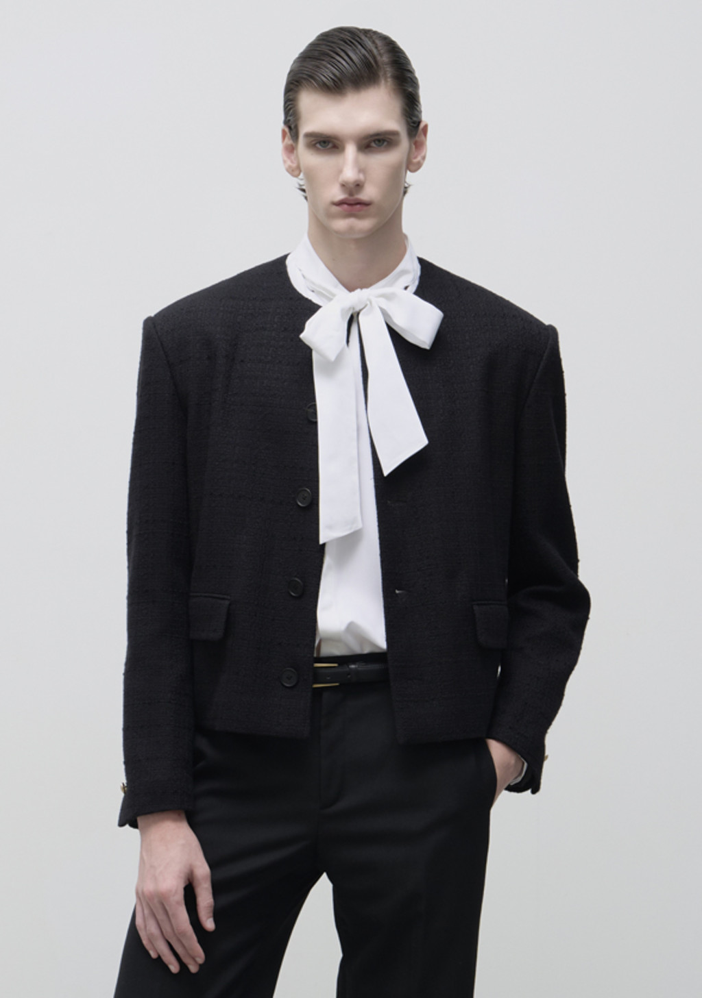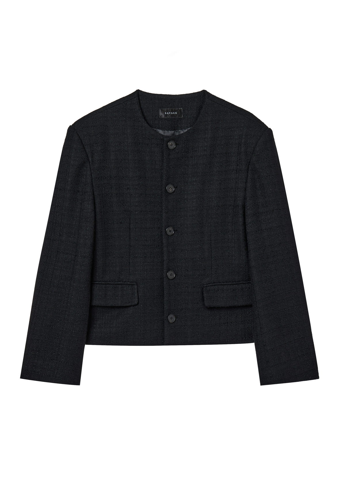 은은한 직조감이 매력적인 일본 수입산 트위드 원단으로 제작된 칼라리스 재킷입니다. 400g의 비스코스/울 블랜디드 원단을 사용하여 보다 탄탄한 실루엣을 강조 하였습니다. 깔끔하게 떨어지는 라운드 넥 쉐입과 크롭한 기장감이 특징이며, 몸판, 어깨, 포켓 등 테일러링 기반의 봉제방식을 적용 하였습니다. 착용시 체형보완을 위해 어깨에 6mm 패드를 부착하였습니다.