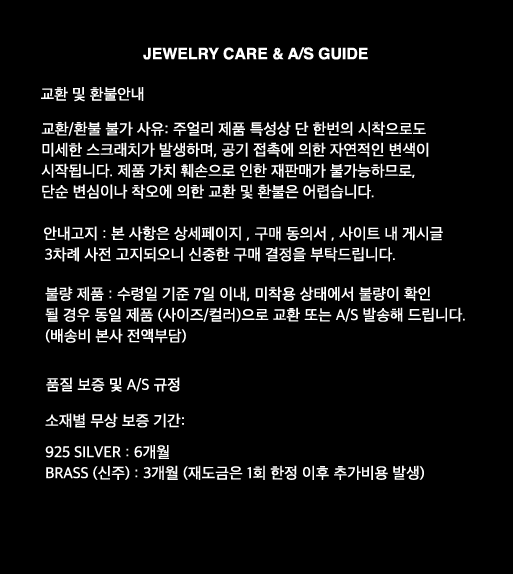 *고퀄리티 밀스 도금을 지향하나, 도금 제품 특성상 착용 환경과 관리 습관에 따라 변색이 발생할 수 있습니다. 변색에 민감하신 분들은 신중히 고려 후 구매해 주시기 바랍니다.